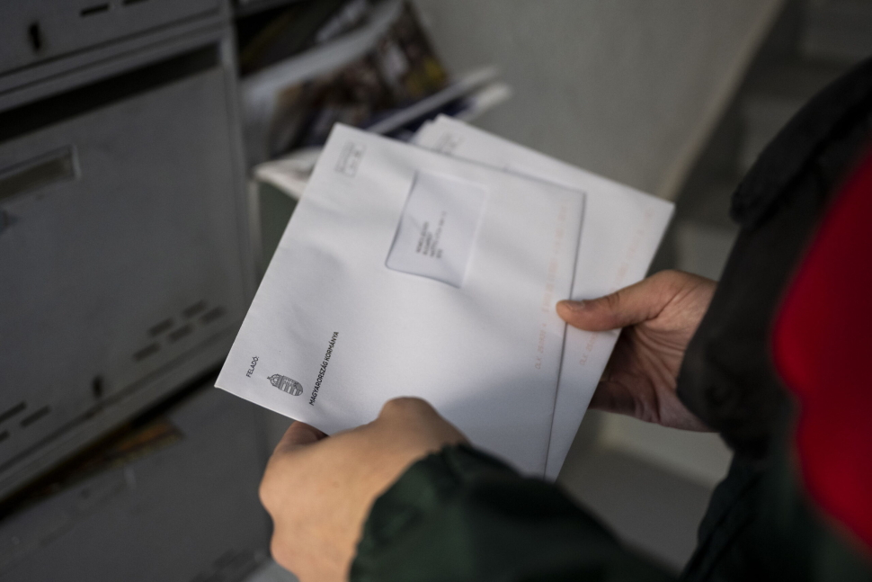Budapest, 2025. október 1. A nemzeti konzultáció kérdõíveit kézbesíti egy postás egy budapesti társasházban 2025. október 1-jén. A kérdõíven öt pontban kérdezik meg az embereket arról, mit gondolnak a közteherviselésrõl. MTI/Bodnár Boglárka